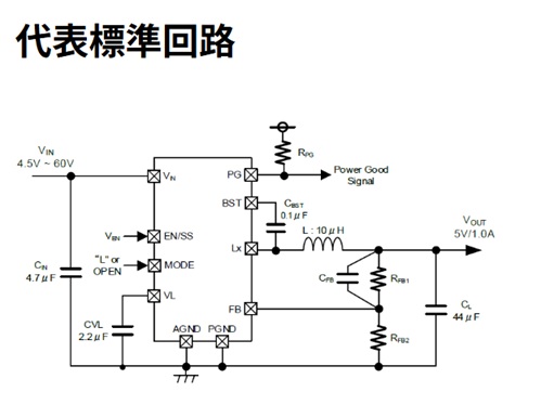 入力電圧4.5V~60V、出力電圧設定2.5V~18.0V、出力電流1.0Aで、高効率で安定した電圧を供給可能です。